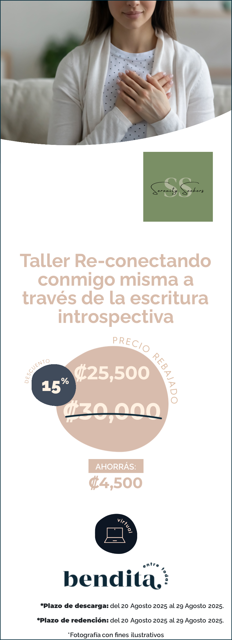 Cuesta 30,000 colones, para las primeras 10 miembros de Bendita 15% descuento, quedaría en 25,500 colones e incluye: